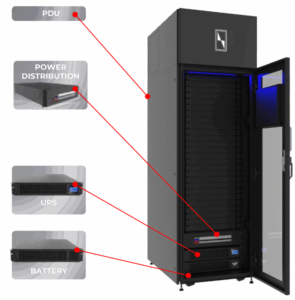 Our MDCs deliver true all-in-one design with integrated cooling, secure enclosure, and full access control/monitoring. Optional UPS, 48VDC, battery, and power modules are available, plus a built-in bypass for easy UPS maintenance.